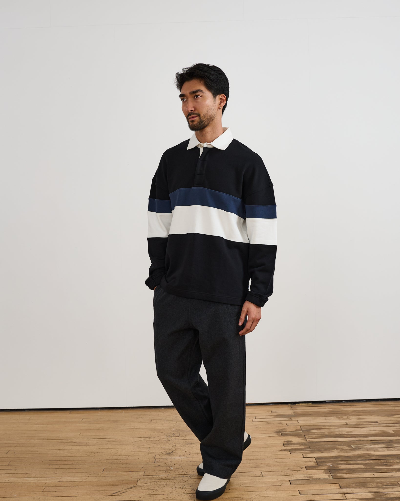 The Bow is a classic take on a traditional rugby shirt... with a Wax twist, of course. Made from 100% loopback organic cotton, featuring vintage panel details, a cotton collar and designed to be worn as a layering piece, the navy striped relaxed fitting Bow is a cross between a classic rugby shirt and a collared polo sweat, with dropped shoulders. Make the preppy style a staple for your autumn wardrobe.