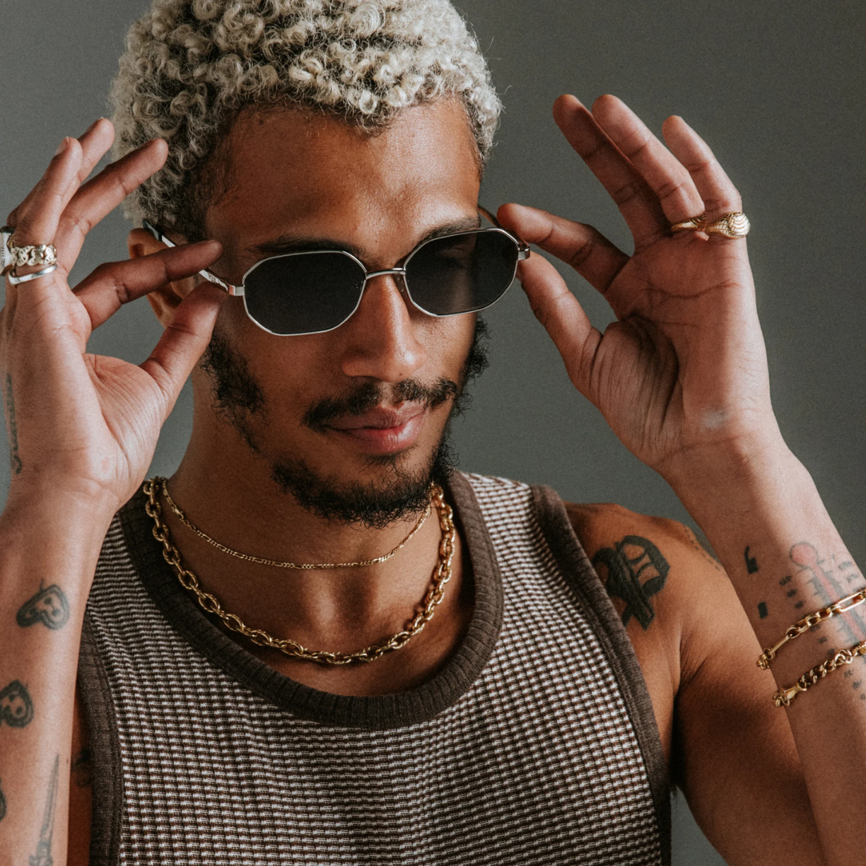 - Angular, flat-edged green lenses and 100% metal frames